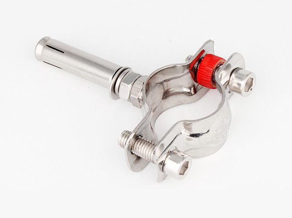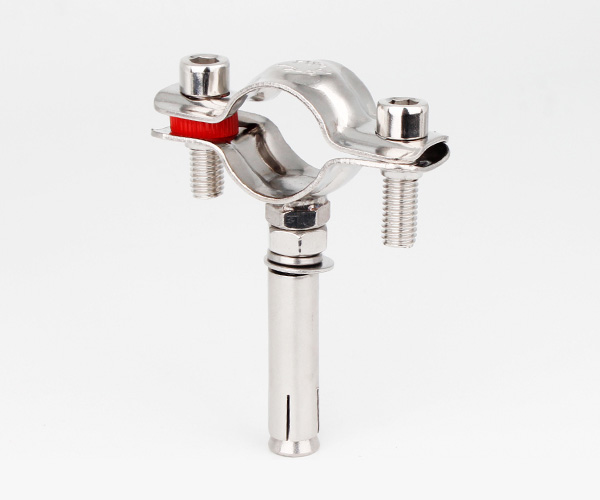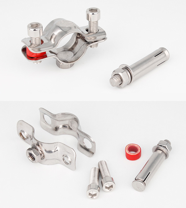 衛生級管支架最常見是由:兩個半圓不銹鋼片、兩個螺栓、一個墊圈(常見為紅色)、一個支撐的鋼管組合而成,這種組合管支架比較美觀,連接方式可為螺紋和焊接兩種。